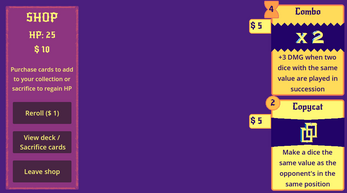 Attack opponents with dices... while using your collection of cards to give yourself an edge. Make your own dices worth more, the opponent's less or add new rules to the game.