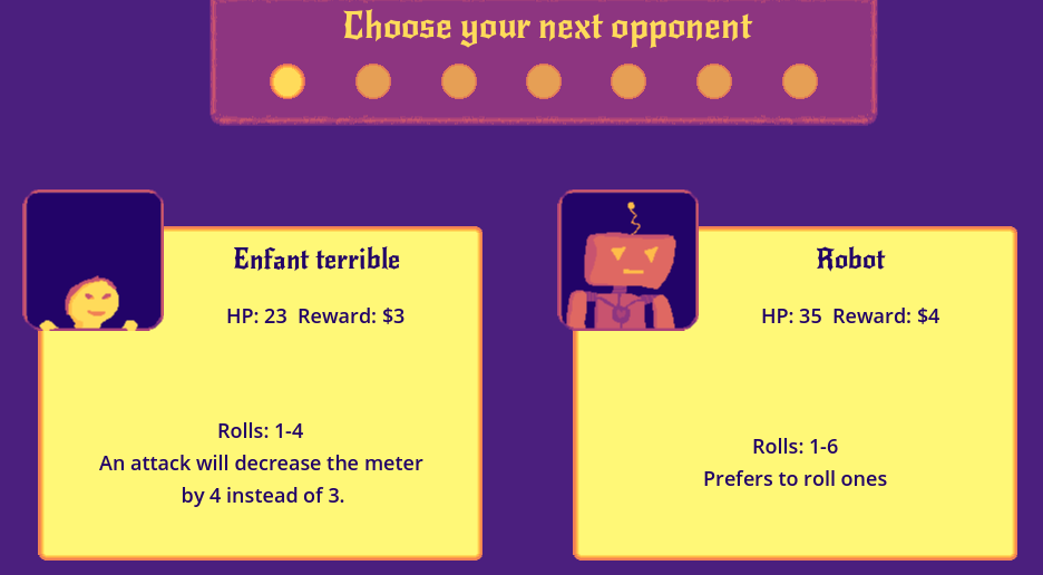 Tags | Dice, Ludum Dare, ludum-dare-58, Mouse only, No AI, Roguelite, Turn-based, Turn-Based Combat, Turn-based Strategy |